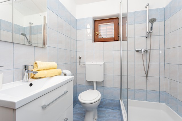 Badezimmer: Im Badezimmer befindet sich eine Dusche, ein Schrankchen und ein WC.