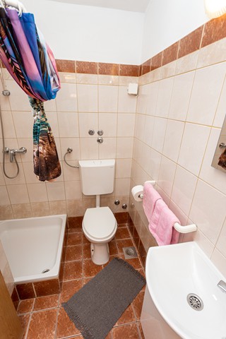 Badezimmer: Im Badezimmer befindet sich eine Dusche, ein Schrankchen und ein WC.